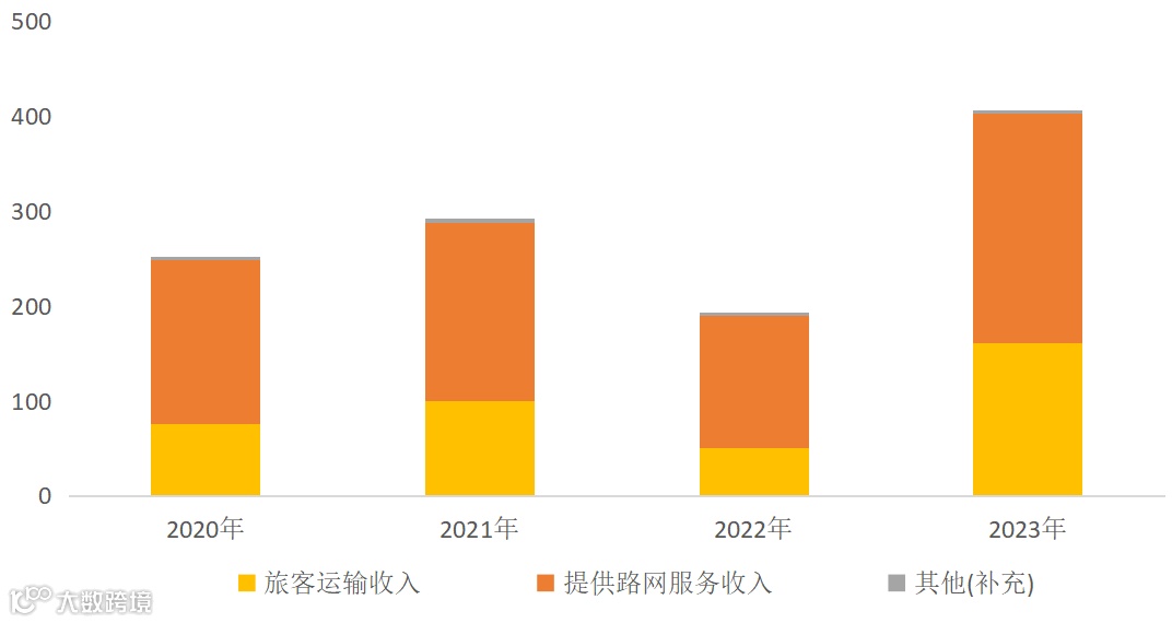 2019年前,两大主营业务收入基本对半,跨线路网服务业务毛利占比约六成。2023年,旅客运输收入占比39.5%,路网服务收入占比59.5%。其他业务占比1%。