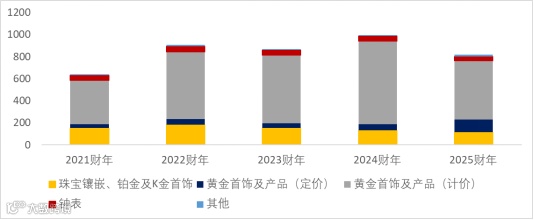 2025财年,珠宝镶嵌、铂金及K金首饰收入占比14.30%,黄金首饰及产品(定价)占比14.60%,黄金首饰及产品(计价)占比66.20%,钟表占比4.90%。