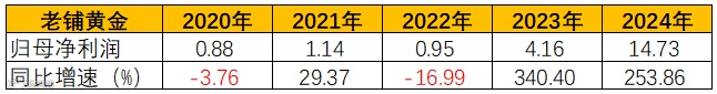 老铺黄金——2024年实现收入85.06亿元,同比增长167.51%;归母净利润14.73亿元,同比增长253.86%。