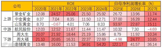 从产业链价值环节看,下游黄金饰品品牌公司ROE更好,在上游公司中,紫金矿业ROE较突出。