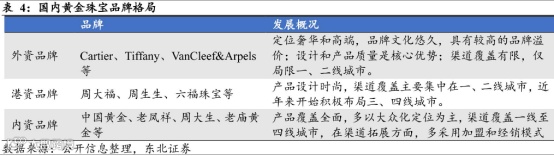 下游——黄金首饰品牌商。国内市场包括内资、港资、外资三类品牌。内资品牌如周大生、老铺黄金、老凤祥、老庙黄金、梦金园、周大生、潮宏基等,港资品牌如周大福、周生生、六福珠宝等,外资品牌如Cartier、Tiffany、VanCleef&Arpels等。