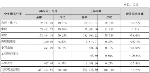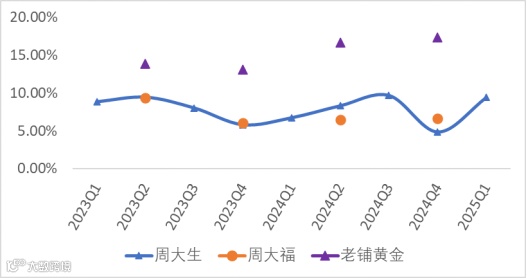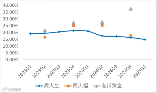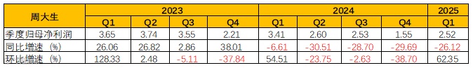 2024年及2025Q1营利双降,整体是受消费不振、外部经济环境的不确定性显著增强、黄金价格快速上涨等因素影响,抑制了消费者的购买热情,使得珠宝首饰消费市场面临较大压力,公司收入同比减少。另外2025Q1还受加盟渠道收入显著下降影响。
