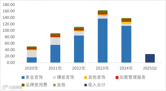 2024年,素金首饰收入占比82.35%,镶嵌首饰占比5.46%,其他首饰占比4.33%,加盟管理服务占比1.59%,品牌使用费占比5.08%,其他占比1.20%。
