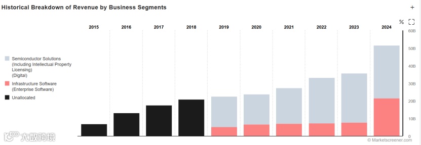 2024财年从收入构成来看,半导体解决方案部门(Semiconductor Solutions (Including Intellectual Property Licensing))占比58.35%,基础设施软件部门(InfrastructureSoftware)占比41.65%。