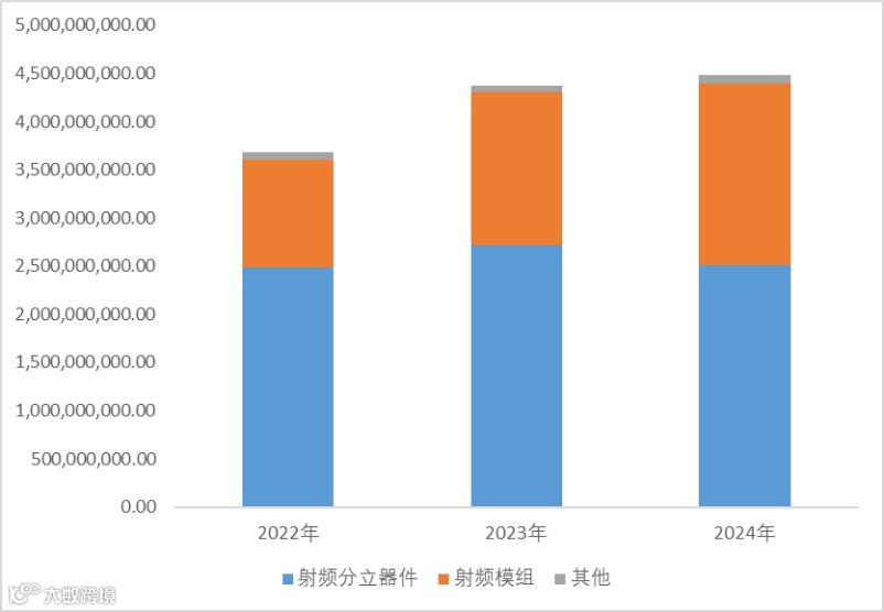 2024财年从收入构成来看,收入98%来自于射频芯片,其中55.91%为分立器件,42.05%为射频模组。