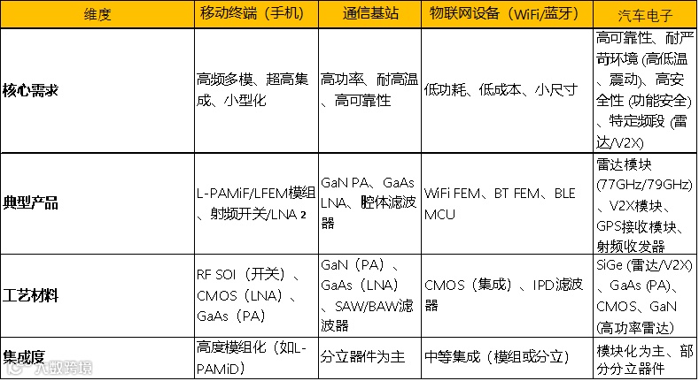 下游——应用于智能手机、通信基站、物联网设备、车载等领域。2023 年,全球射频前端市场规模已增长至 210 亿美元,呈现显著分化格局。