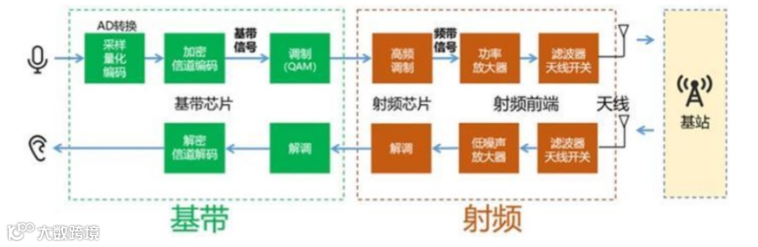 基带和射频是无线通信中不可或缺的部分。模拟信号通过基带中的 AD 数模转换电路,完成采样、量化、编码,变成数字信号,射频(Radio Frequency,RF)由基带送来的信号需要经过调制、功率放大,之后送到天线,经过滤波,由天线振子发射出去。