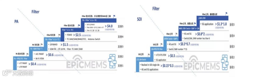 国内企业的难度体现在模块化趋势下,如何更好地突破滤波器SAW/BAW能力。以发射端模组为例,在 n77、n79 和 n41 PAMiF 产品中,PA 为研发主要壁垒所在,但进阶到PAMiD 产品之后,滤波器则逐渐成为研发核心关键,具备滤波器设计和制造工艺技术有望占据行业中发展优势。