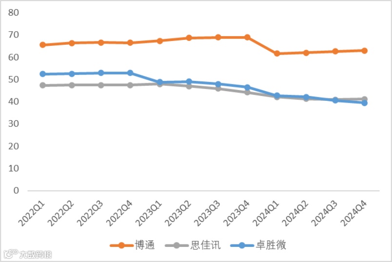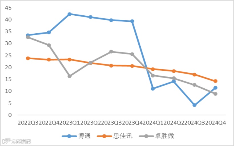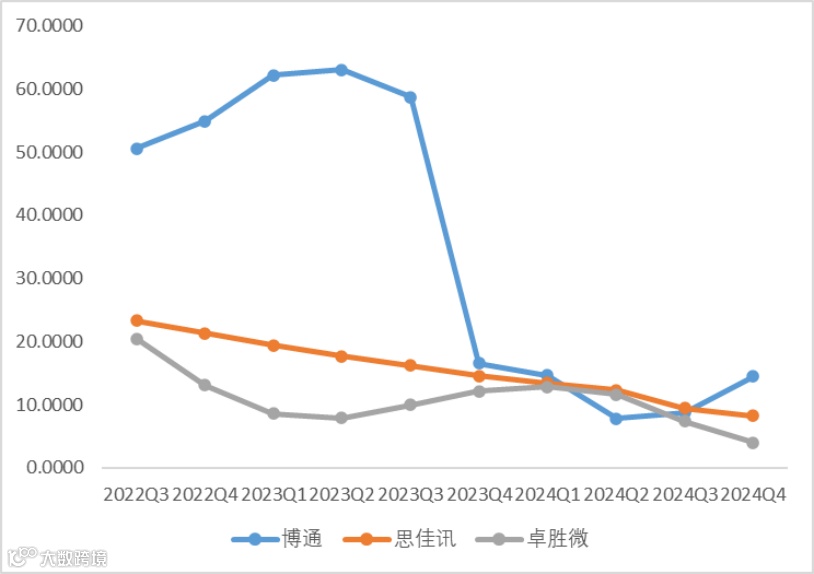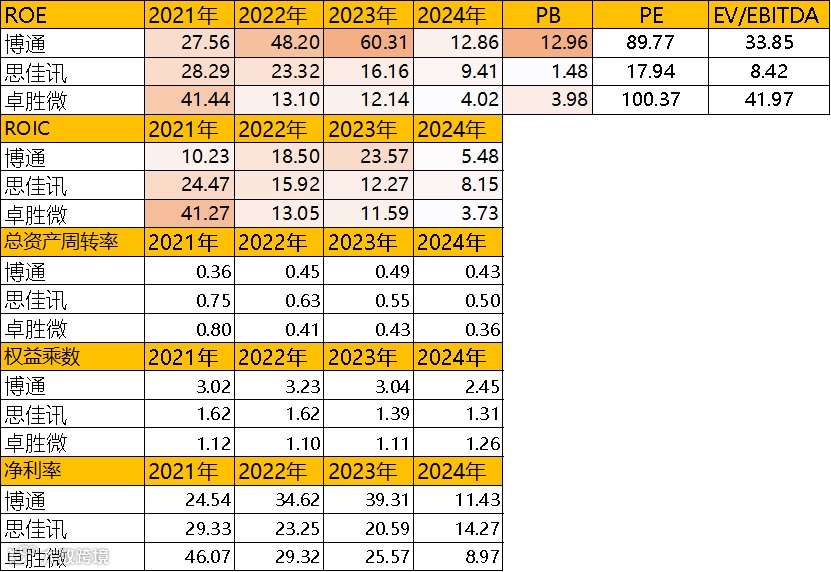 从净资产收益率来看,博通>思佳讯>卓胜微,净利率是主导因素。