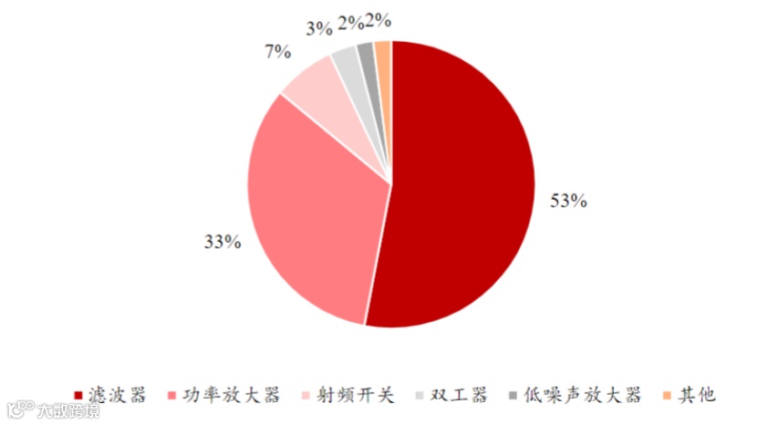根据前瞻产业研究院数据,滤波器约占射频器件价值量的53%,功率放大器占 33%,射频开关、双工器和低噪声放大等占比 14%。