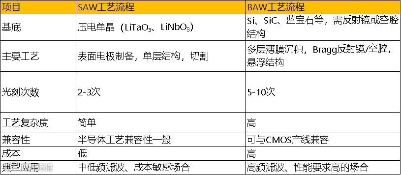 SAW工艺以表面电极加工为主,流程短、成本低,适合中低频应用。BAW工艺涉及多层薄膜、反射镜/空腔、悬浮结构,工艺复杂,适合高频高性能需求,关键的工艺步骤是压电薄膜(如AlN、ScAlN等)及关键金属层(如钨W)的厚度沉积与刻蚀控制,尤其是对金属层(如W)刻蚀深度的精准控制。(本报告全文详见https://mvzxk.xetsl.com/s/2iNIZ6,加微bgys2015获取阅读权限)