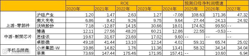 从盈利能力来看,中游和下游环节,特别是定位高端手机的苹果和主要供应商博通、思佳讯盈利能力较好。