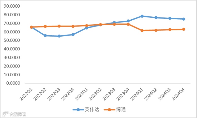 图:英伟达vs博通毛利率(%),