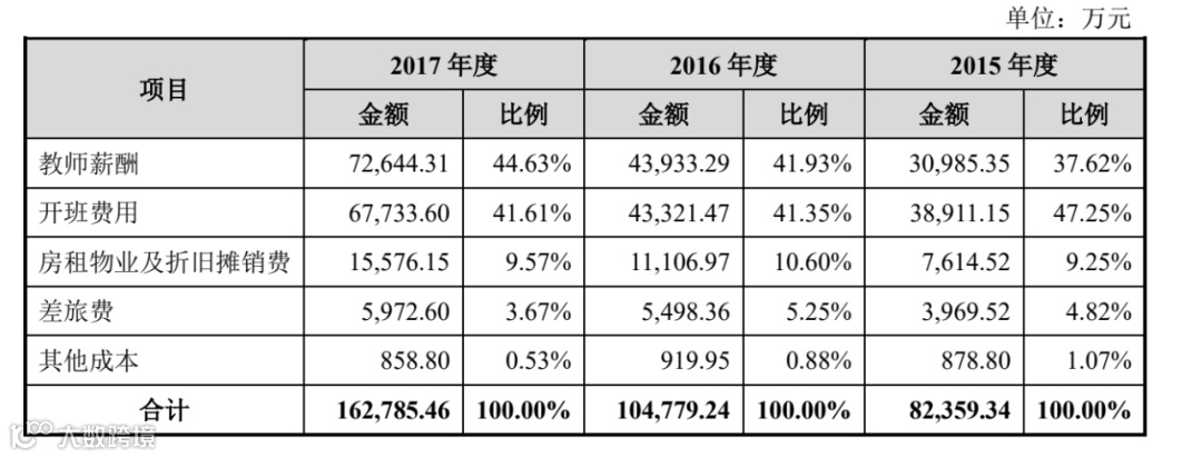 中公教育主要成本是教师薪酬和开办费用,分别占营业收入的20%和15%。