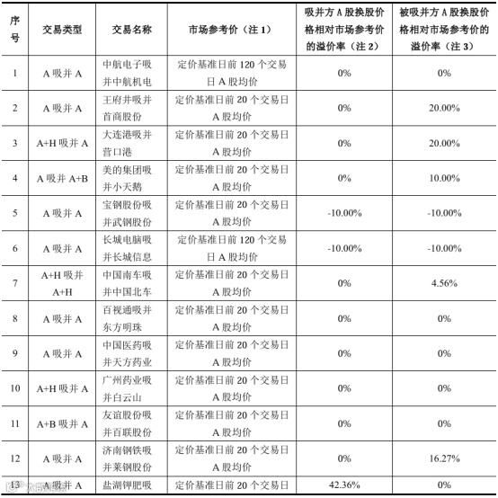 自《重组管理办法》颁布以来的21个A股上市公司换股吸收合并A股上市公司的交易中,同为“A+H吸并A+H”的仅中国南车吸并中国北车一例,该案例中A股与H股也采用了相同的换股比例。