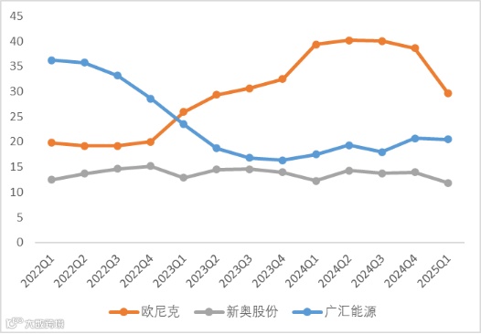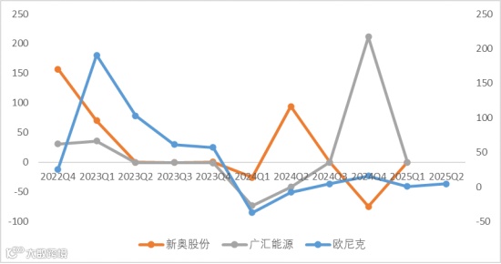从2024年收入体量来看,欧妮克(1559.74亿元)>新奥股份(1359亿元)>广汇能源(364亿元)。