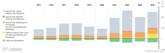 2024年收入构成中,天然气液体(Natural Gas Liquids)占比61%、天然气收集与处理(Natural Gas Gathering and Processing)占比18.33%、精炼产品与原油(Refined Products and Crude)占比17.81%。