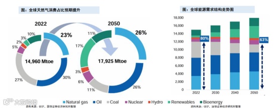 在化石能源消费占比下降的大趋势下,天然气消费预期增长,2022年全球天然气消费3441百万吨油当量(3.94万亿立方米),2050年天然气预期消费量将提升至4661百万吨油当量(5.34万亿立方米)。