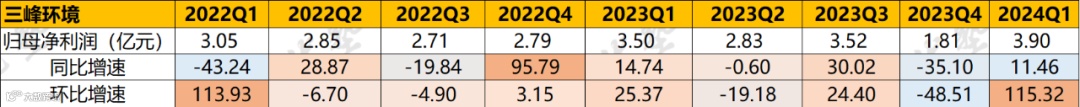 二、三峰环境——2024Q1,实现营业收入15.52亿元,同比增长0.42%;归母净利润3.90亿元,同比增长11.46%;扣非归母净利润3.86亿元,同比增长10.88%。毛利率37.22%,同比增长3.58pct,或由于公司项目运营及设备销售收入占比提升,业务结构进一步优化,整体毛利率取得进一步改善。