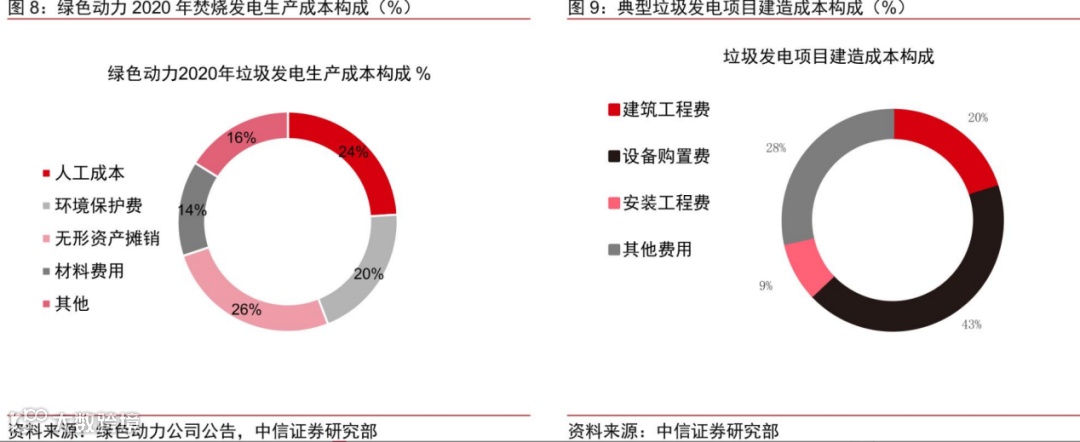 垃圾焚烧发电运营成本中,折旧摊销占比30%左右,材料费用、动力费、环保费等运营成本占比40%左右,人工占比10%