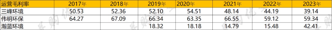 1)垃圾焚烧运营收入涵盖的内容不同,其中,瀚蓝环境的毛利率较低,主要是其运营收入中包含项目建设收入(毛利率10%),另外两家都是纯粹的运营收入,2023年瀚蓝环境单独拆分建造业务收入,运营业务毛利率提升至42%。
