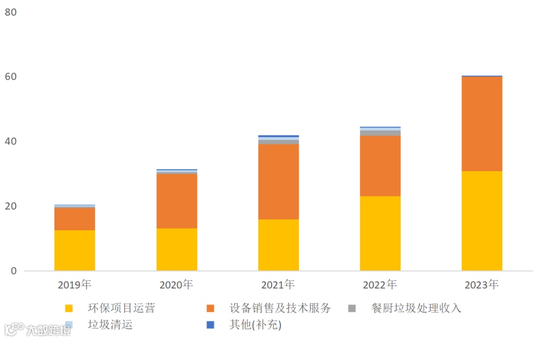 2023年,项目运营收入占比60.5%(毛利占比74.5%),EPC建造业务占比21%,设备销售收入占比提升至15.9%,新增垃圾收运业务占比2.4%。