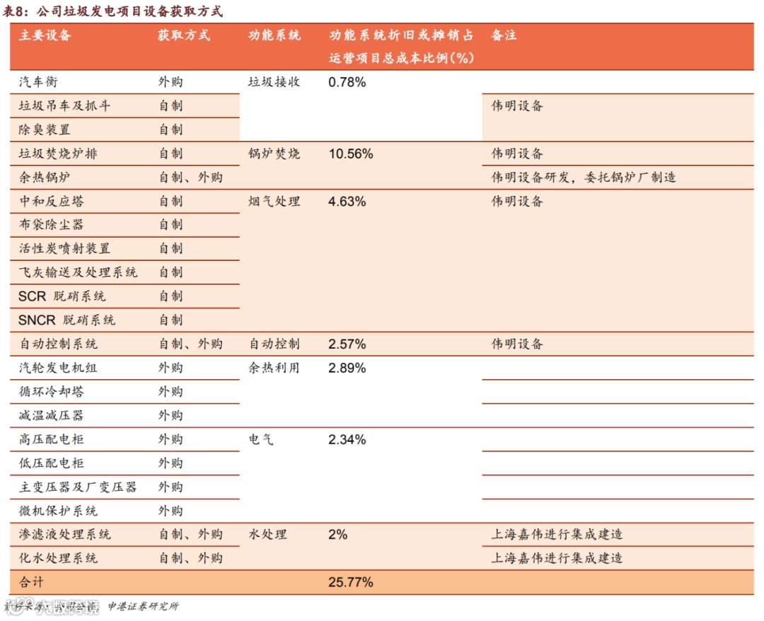 3)伟明环保土建部分全部外包,关键设备能够实现自建,投资成本较低,确认的折旧摊销费用较少。公司自称是垃圾焚烧发电产业链一体化的运营者,可自行开发、设计并制造垃圾焚烧炉、烟气处理系统、自动控制系统、渗滤液处理等关键设备系统,降低了项目设备的采购成本;公司的专业度和多年行业经验和资源,能降低项目建设成本。