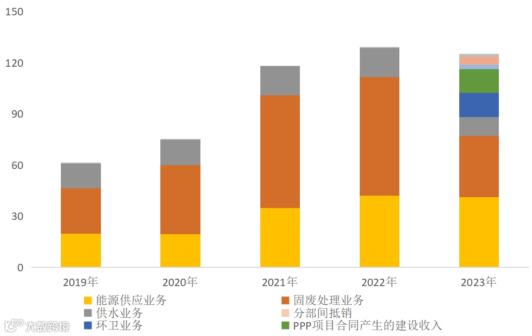 2023年,能源供应业务收入占比33%,固废处理业务占比28.5%,环卫业务占比11.2%,PPP项目合同产生的建设收入占比11.12%,供水业务占比8.85%,排水业务占比3.65%。但是,固废处理业务毛利占比在50%以上,能源供应业务毛利占比14.5%。