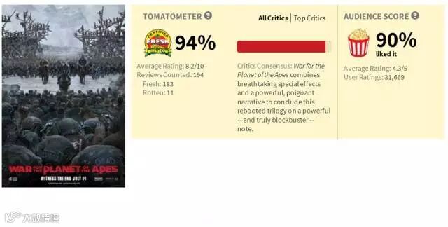 烂番茄新鲜度94%,均分高达8.2,MetaCritic均分达79