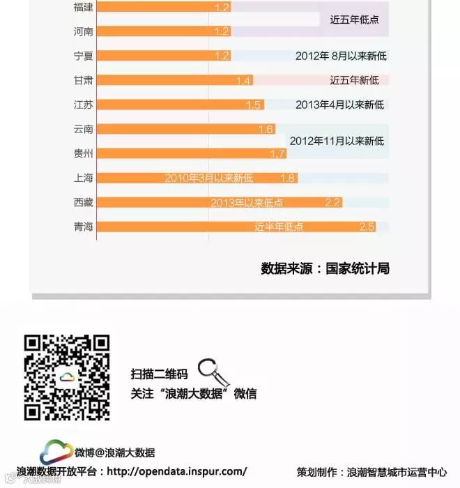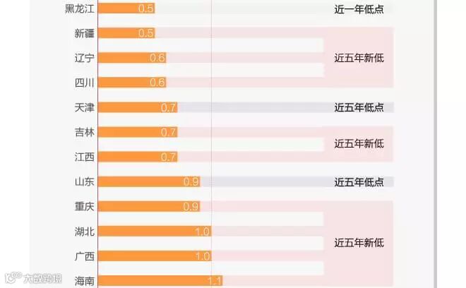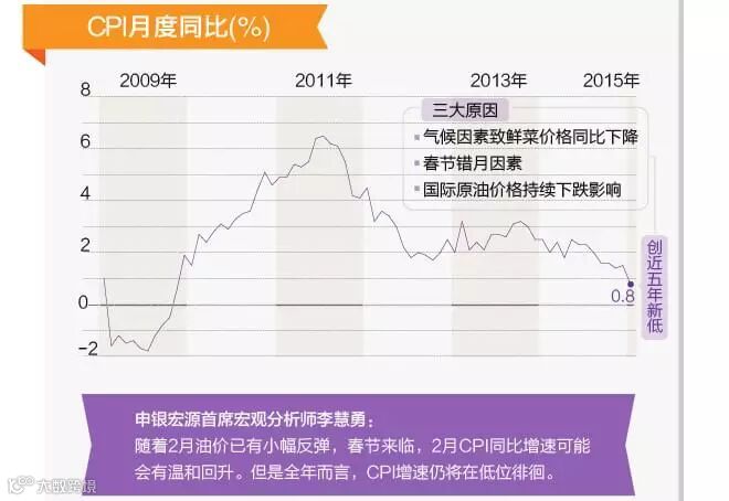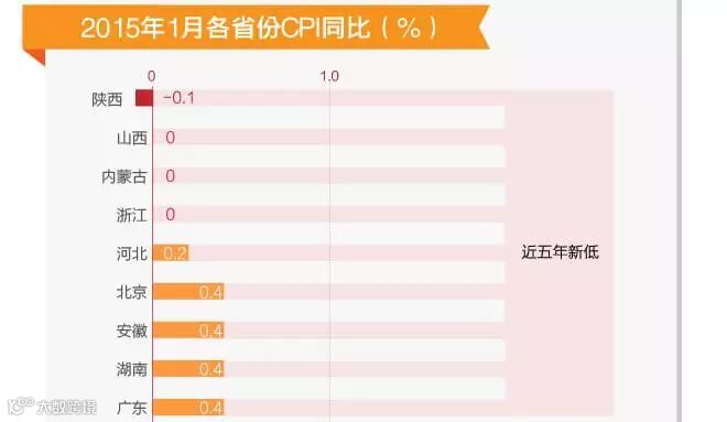 2015年1月,全国居民消费价格总水平(CPI)同比增速跌破1%,创自2009年12月以来新低。全国31个省份中,23个省份CPI同比涨幅创近五年新低(或低点),18个省份的CPI同比涨幅跌破1%,其中山西、内蒙古、浙江的涨幅为零,陕西出现负增长,同比下降0.1%。申银宏源预计,年内CPI增速仍将在低位徘徊。