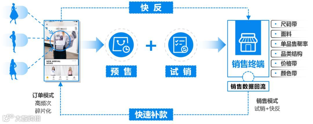 打通数据垂直链路,快反商品先少量铺货(线上测款),监控终端数据,及时追单、砍单;同时试销数据分析回流到商品企划,精准定位快反策略,保障商品的新鲜度和爆款打造的深度。