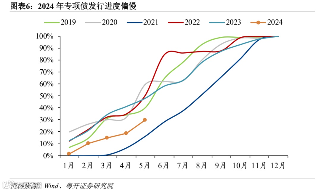 从专项债来看,2024年上半年,新增专项债完成全年限额进度39.14%、慢于去年同期18.02个百分点;1-5月,全国广义财政支出同比下降2.2%,其中一般公共预算支出同比增长3.4%,完成全年预算进度37.96%、略低于去年同期,政府性基金预算支出同比下降19.3%,完成预算进度23.05%,低于往年水平。
