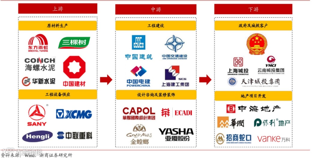 上游——包括钢铁、水泥、玻璃、工程塑料等建材厂商,比如中国建材、海螺水泥、东方雨虹等,工程机械厂商如三一重工、中联重科等。