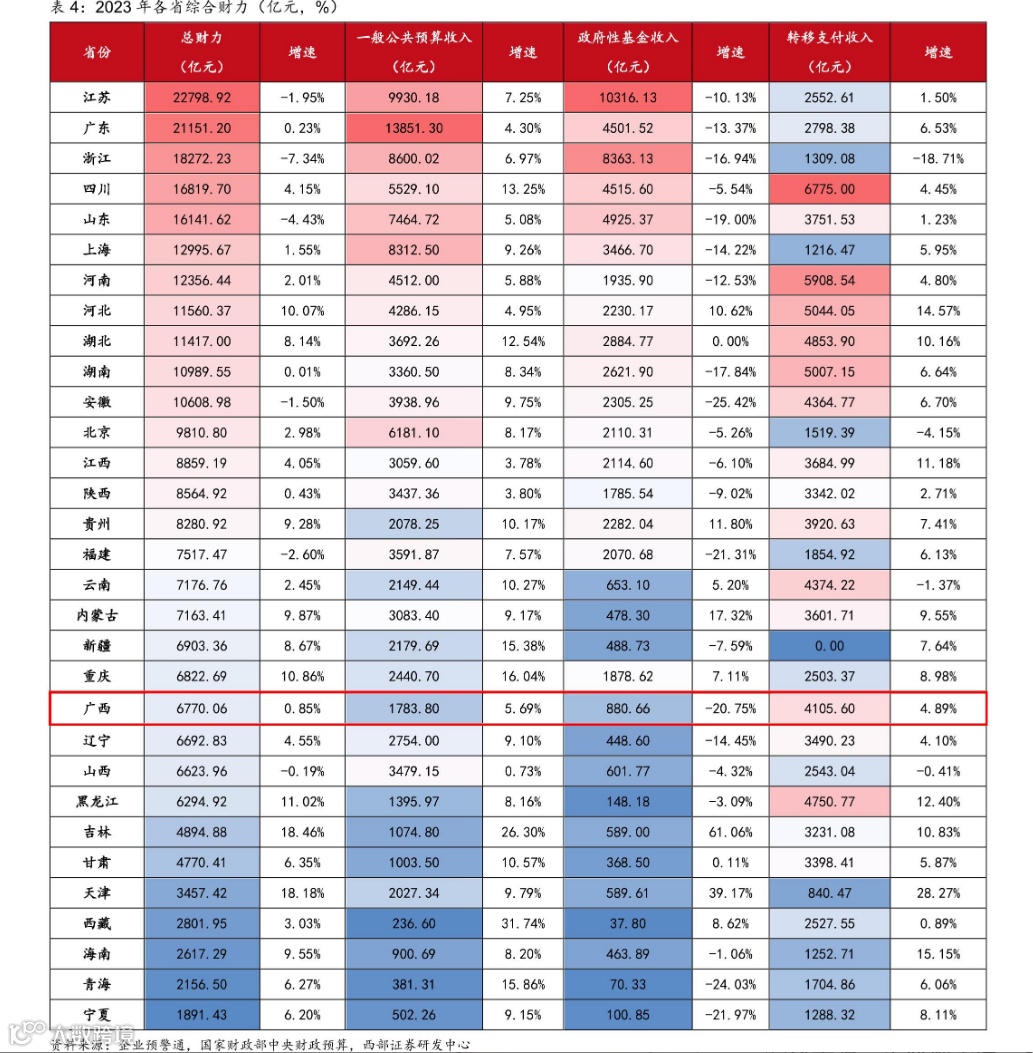 从综合财力看,2023年,排名前五的省份分别是江苏、广东、浙江、四川、山东。地方省份财力越靠前,在经济低谷期进行大规模基建开支的可能性和力度会越大,这是在如今这个时间点,研究这个行业的意义所在。