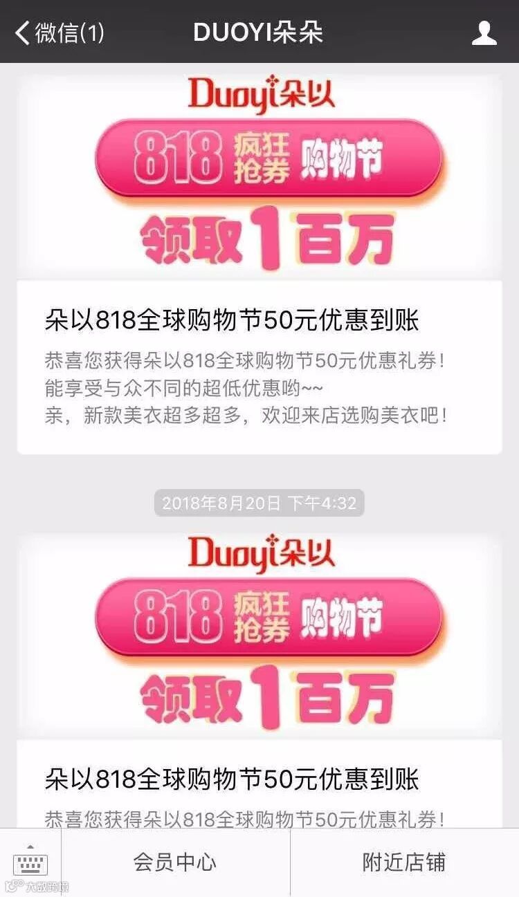 1.8月中旬,朵以华南地区部分店铺上线“818购物节”促销活动:会员线下消费满一定金额,品牌会通过丽晶“微会员”系统推送相应的现金优惠券,吸引复购。