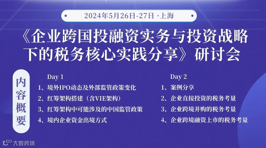 为此,我们并购优塾将在上海于2024年5月26日-27日举办《企业跨国投融资实务与投资战略下的税务核心实践分享》专题研讨会,学员通过系统的学习后即可运用到自身企业发展实践中。本专题研讨会兼具国际化和前瞻性视野、大量案例和实操方案、兼顾法律和财税风险指引,提供了企业国际化发展和实操手册。