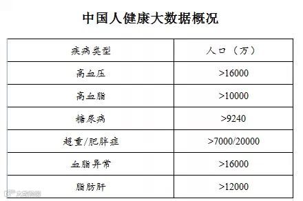 在总人口为13亿多的中国人中,中国高血压人口有1.6~1.7亿人,高血脂的有将1亿多人,糖尿病患者达到9240万人,超重或者肥胖症7000万~2亿人,血脂异常的1.6亿人,脂肪肝患者约1.2亿人。