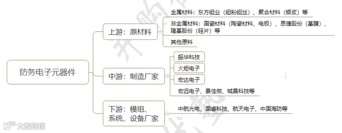 中游——防务电子元件生产厂家。我们这里要讨论的三家公司主要产品是无源电子元件,即电阻、电容、电感。
