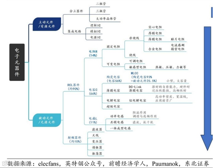 电子元件,可分为无源器件(被动元件)和有源器件(主动元件)。无源器件主要是电容、电阻、电感,有源器件主要是分立器件(单独的晶体管)和集成电路。