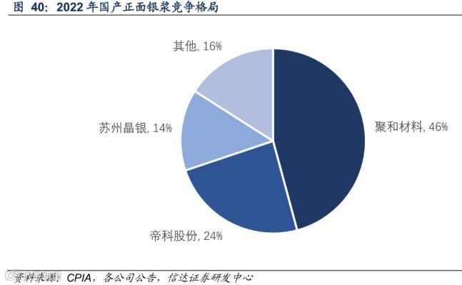 一般分为导电银浆、电阻银浆、电熔银浆,由于其90%用于导电,因此常被称之为导电银浆。代表企业有聚合材料、帝科股份、苏州晶银、苏州固锝等。2022年用于光伏电池的正面银浆,聚合材料市占率46%,居首位,帝科股份市占率24%,居第二位。