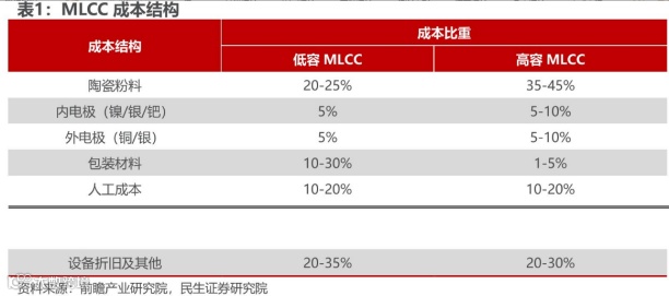 从成本角度看,MLCC的成本主要由原材料、包装材料、人工和设备折旧等构成,其中原材料陶瓷粉料占比较高,其在低容MLCC中占比20-25%,在高容MLCC中则占比高达35-45%,对MLCC的性能至关重要。