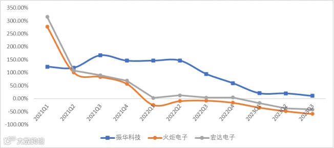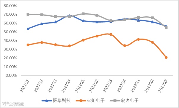 从年度综合毛利率看,近几年,宏达电子>振华科技>火炬电子,宏达电子的自产电容业务毛利率较高。火炬电子2023Q3毛利率下降较多,主要由于毛利率相对较高的自产业务销售收入下降。