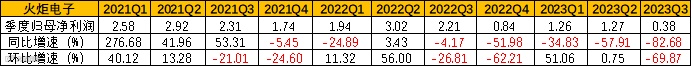 火炬电子——2023前三季度,实现收入27.14亿元,同比-4.32%;归母净利润2.92亿元,同比-59.32%。自产元器件业务受下游需求、市场竞争加剧等影响收入有所下降,贸易业务受供需、经济形势影响,消费类客户端仍以消化库存为主,收入也有所下降。