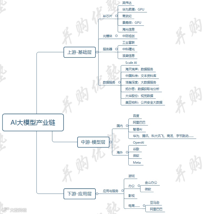 上游——基础层(算力和数据):以云服务、AI芯片、光模块、数据采集/标注等厂商为主,为行业提供基础性支持。代表公司有英伟达、AMD、华为昇腾、燧原科技、壁仞科技、阿里云,以及复旦微电、中科曙光、中际旭创等。