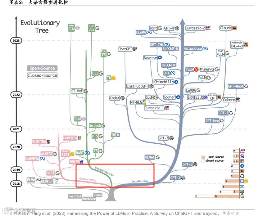 这种架构能够更好地理解和预测语言模式,尤其适合处理开放式的、生成性的任务。以OpenAI的GPT、谷歌的Bard、Meta的LLaMA、DeepMind的Chinchilla、Anthropic的Claude为代表。
