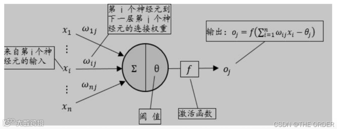 科学家为了复制这个神经元的功能,将它抽象化为一个计算机模型,如下图。其中,X1、X2、Xn是多个输入信息,W1、W2、Wn是各信号的权重,在达到一定阈值θj后,神经元被激活,然后将输入信息消化处理,传递出输出信息Y。