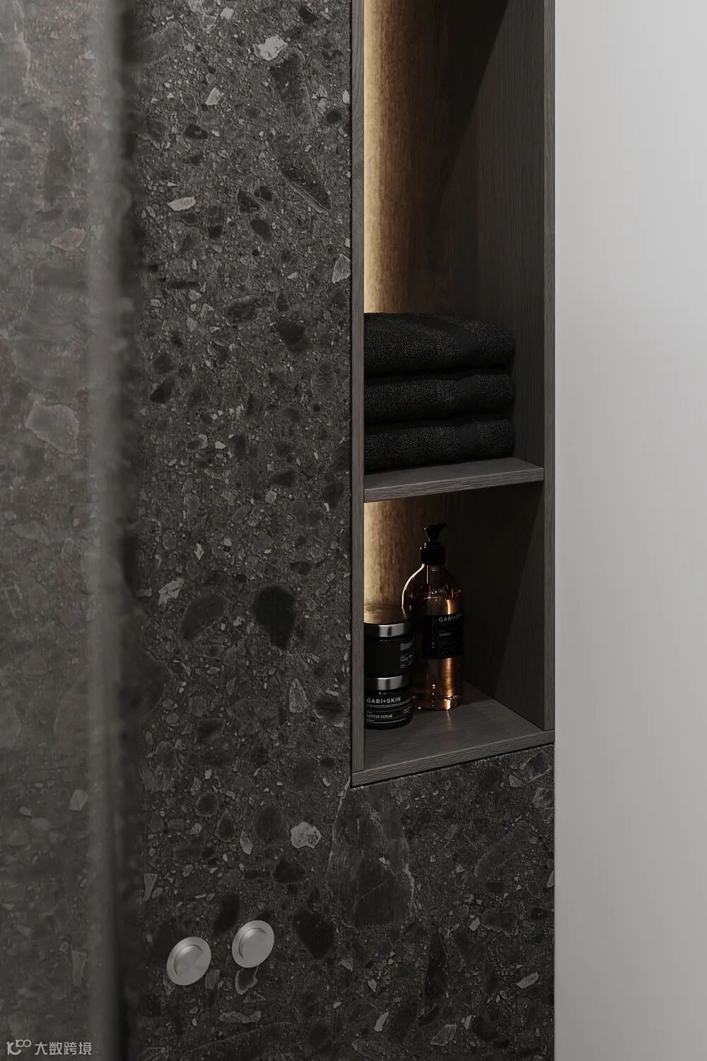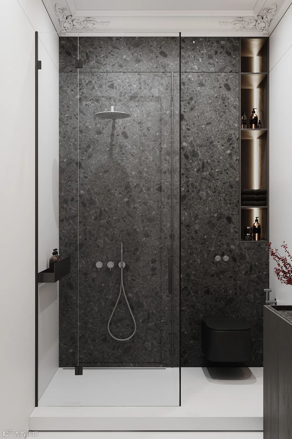 石纹搭配,玻璃镜条和灯光的设置,传递纯净简洁的气息,线条优美,创造了一种优雅、永恒的空间感。