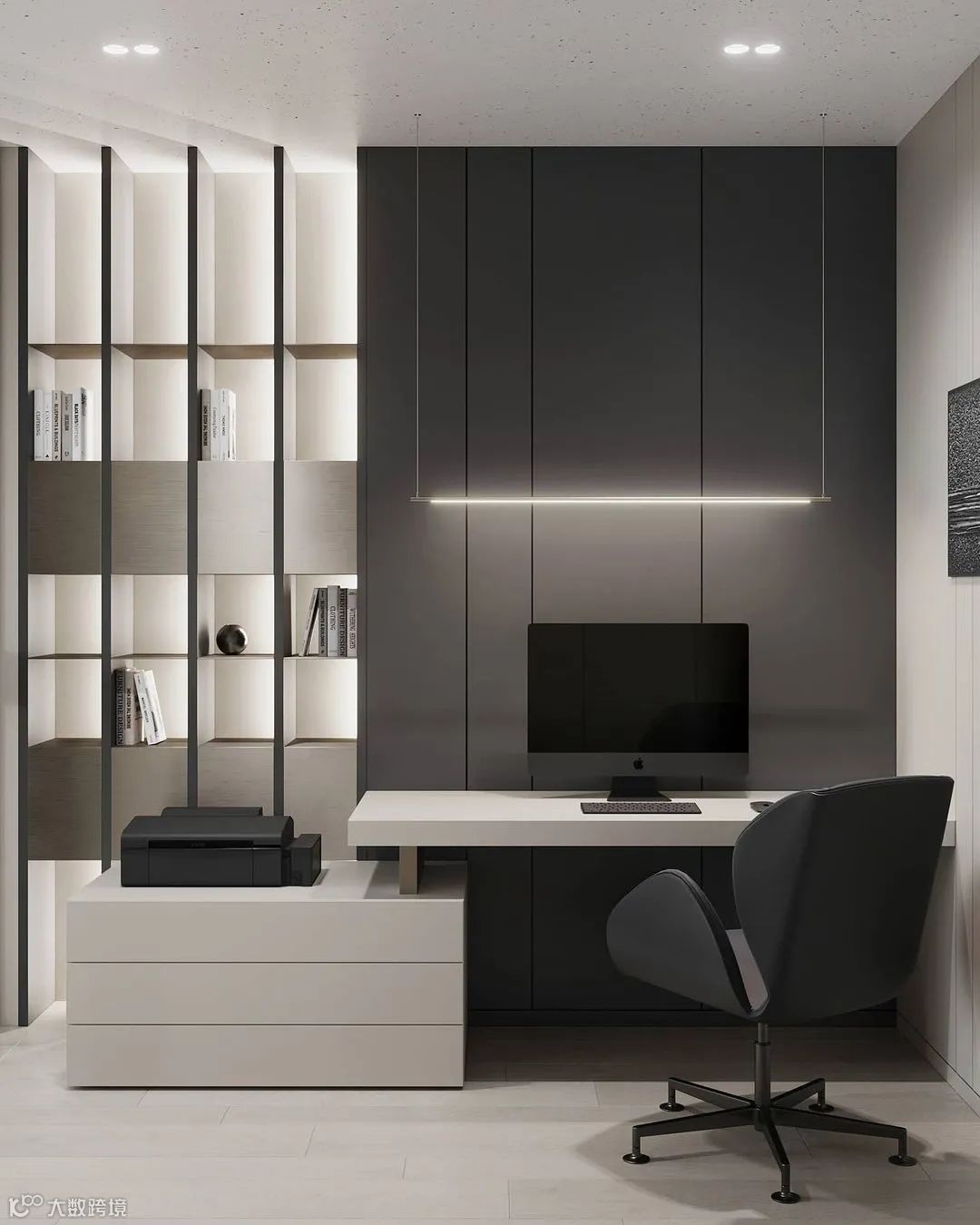 灰白色的办公室一切从功能入手,空间结构图明晰美观,特别强调外观简练、简练。
