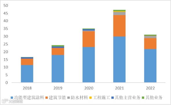 2022年,营收31.08亿元,较2021年下降,主要是市场需求疲软。其中,功能型建筑涂料收入占比70.24%,建筑节能占比22.84%,防水材料占比4.28%,工程施工占比0.58%,其他主营业务占比0.23%,其他业务占比1.80%。
