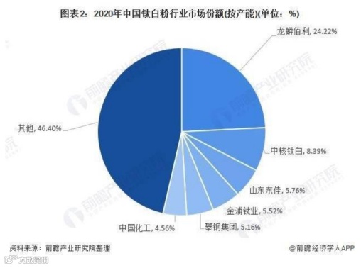 钛白粉是涂料的重要原料,60%的钛白粉用于生产涂料。在钛白粉厂商中,龙佰集团(龙蟒佰利)、中核钛白份额较领先。